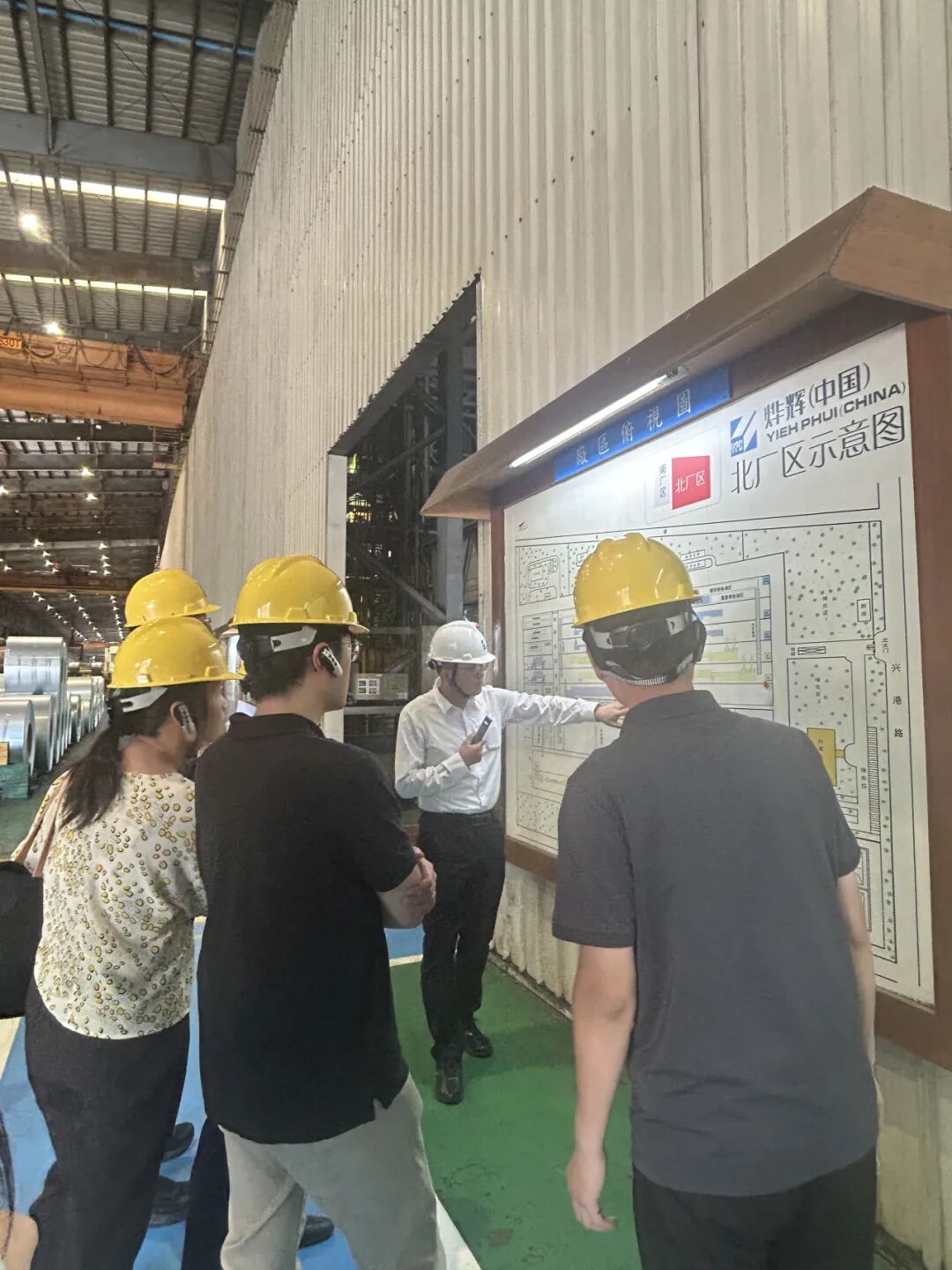 在烨辉工厂生产车间,新员工沿着全生产线参观,亲眼见证钢板从钢卷原料到成品的完整流程。